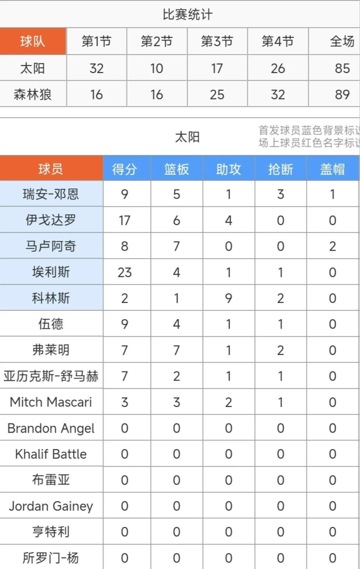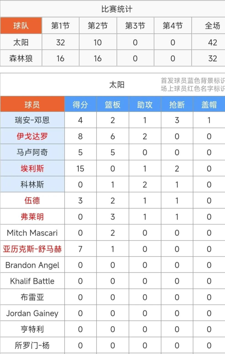 第一节开战,埃利斯抛射命中2分,米勒中距离还击2分,马卢阿奇回来外线一箭穿心飙进3分,伊戈达罗飞身劈扣得2分,太阳队开局7:2领先!埃利斯同样外线百步穿杨远射3分射进锦上添花,贝利快速反攻还击2分止血。两队陷入混战状态,你来我往首节结束太阳队32:16领先森林狼队16分,埃利斯单节爆发砍下12分1抢断1盖帽。